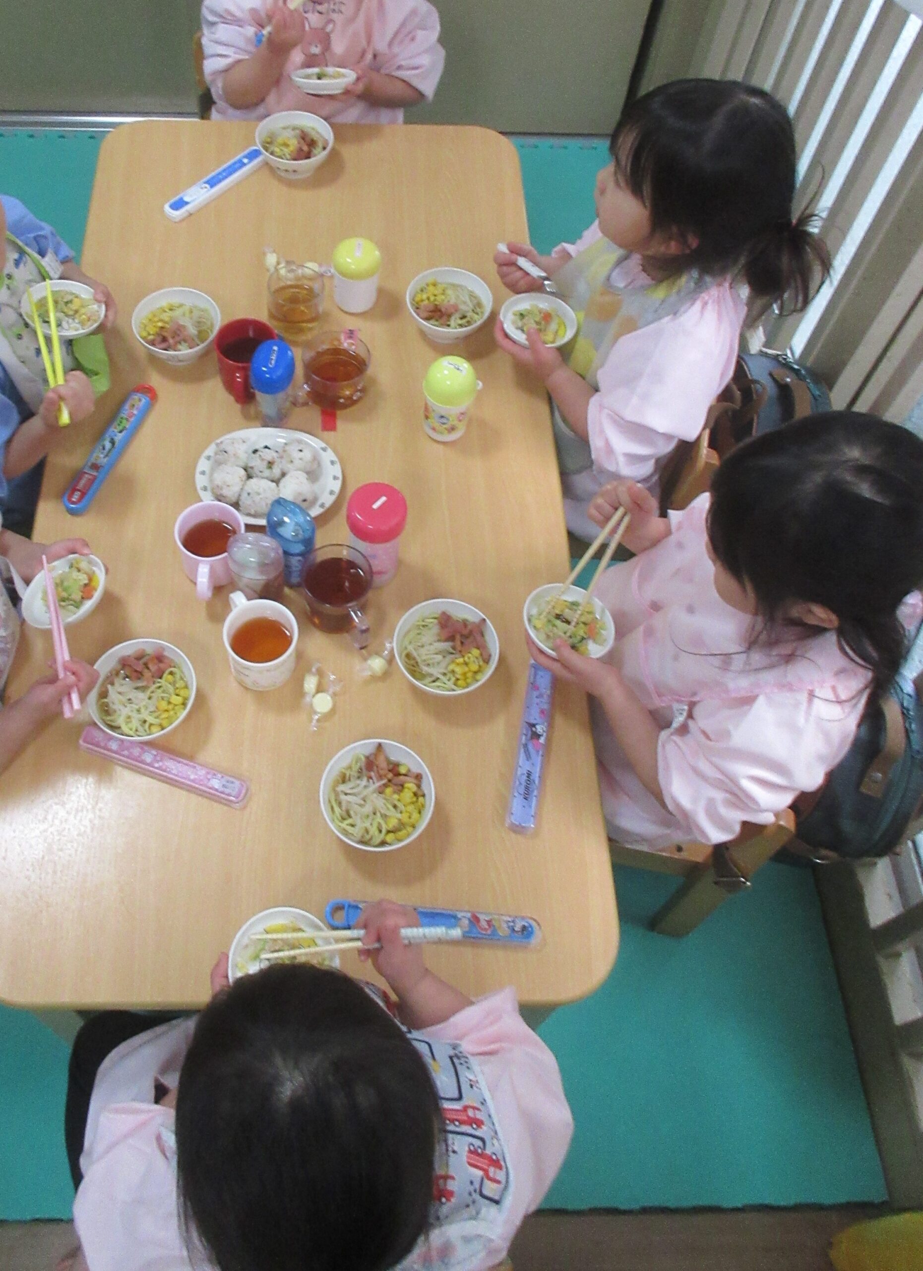 また、健康で元気いっぱい遊べるように食育にも力を入れているので、おにぎりクッキングやおでんバイキング等、毎月、子ども達の好きなメニューを用いて食への興味・関心を育て、好き嫌いなく何でも食べる元気な体づくりを目指しています。